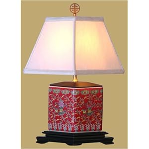 Asian Décor - 17" Chinese Red Porcelain Square Jar Oriental Desk Lamp w/ Shou Symbol Finial