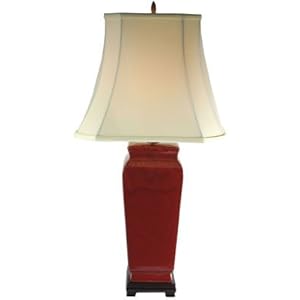 Finely crafted porcelain oriental lamp- square shaped ceramic vase body w/ dark oxblood glaze, elegant dark hardwood base, beautiful white sateen fabric shade, lovely decorative brass finial, UL approved 3 way switch, wiring and socket, accommodates standard 3 way & single filament bulbs, ships in 48 hours professionally packed, fully insured from our Massachusetts warehouse via Fed Ex Home delivery, expedited delivery available.